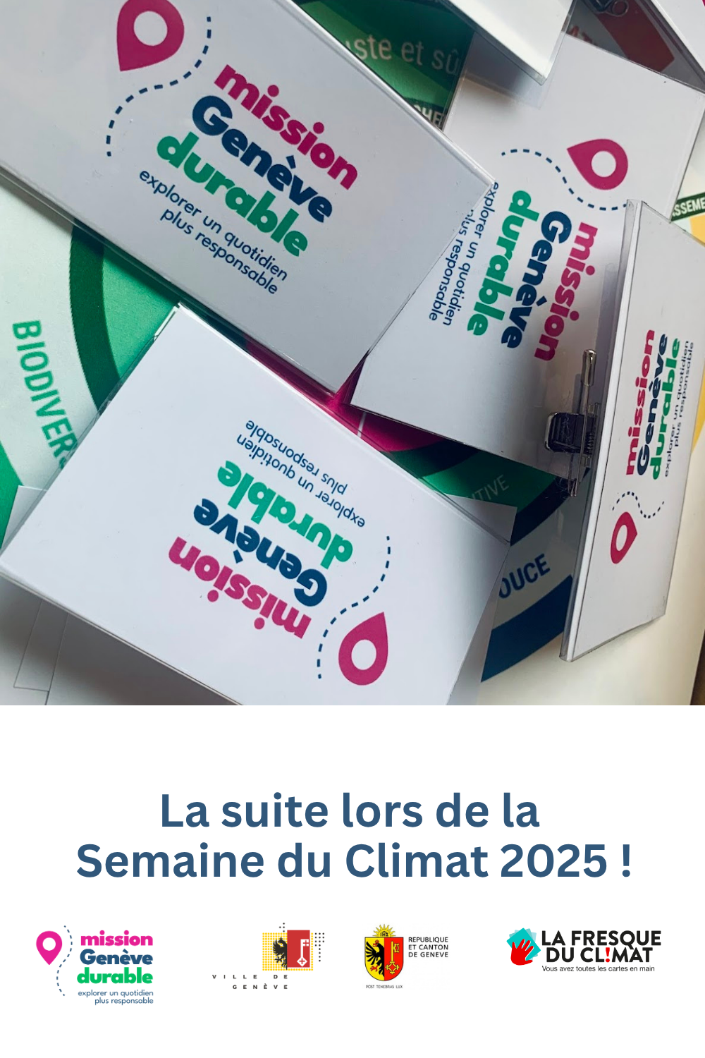 Lors de la Semaine du Climate de Genève 2025, Mission Genève Durable propose des ateliers facilités par une équipe bénévole, sur des thématiques riches et variées. Ces ateliers et Fresques invitent à mieux découvrir le Climat, la protection de la Biodiversité, le Bonheur durable et partagé, le Textile, le Sol, les Limites planétaires, l’Adaptation au changement climatique. Le programme inclut aussi une Marche du Temps profond.